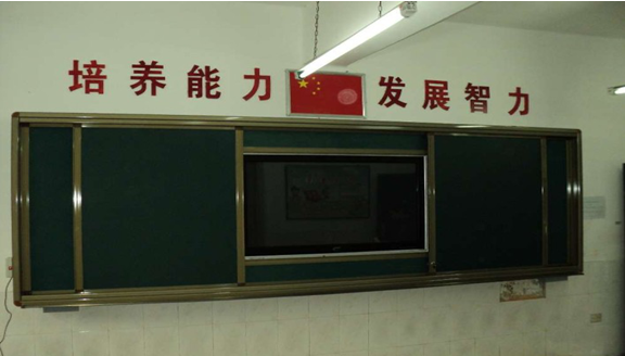 2. 外滑軌裝置:安裝兩塊移動綠板,兩綠板尺寸之和與內軌道白板的尺寸一致;進行常規(guī)教學時,可將此綠板滑動到液晶電視前方,保護液晶觸摸一體機,增大書寫面積;進行多媒體教學時,將綠板拉開,使用液晶觸摸一體機。